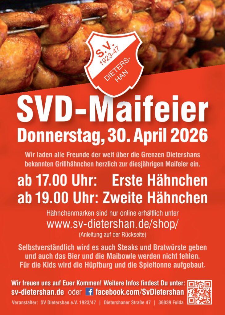 Am Mittwoch, den 30. April findet wieder das legendäre Maifest des SV Dietershan statt. Es gibt noch vereinzelte Hähnchen vom Buchenholzgrill. Hier der Link zum Vorbestellen für die Hähnchen und hier der Flyer.