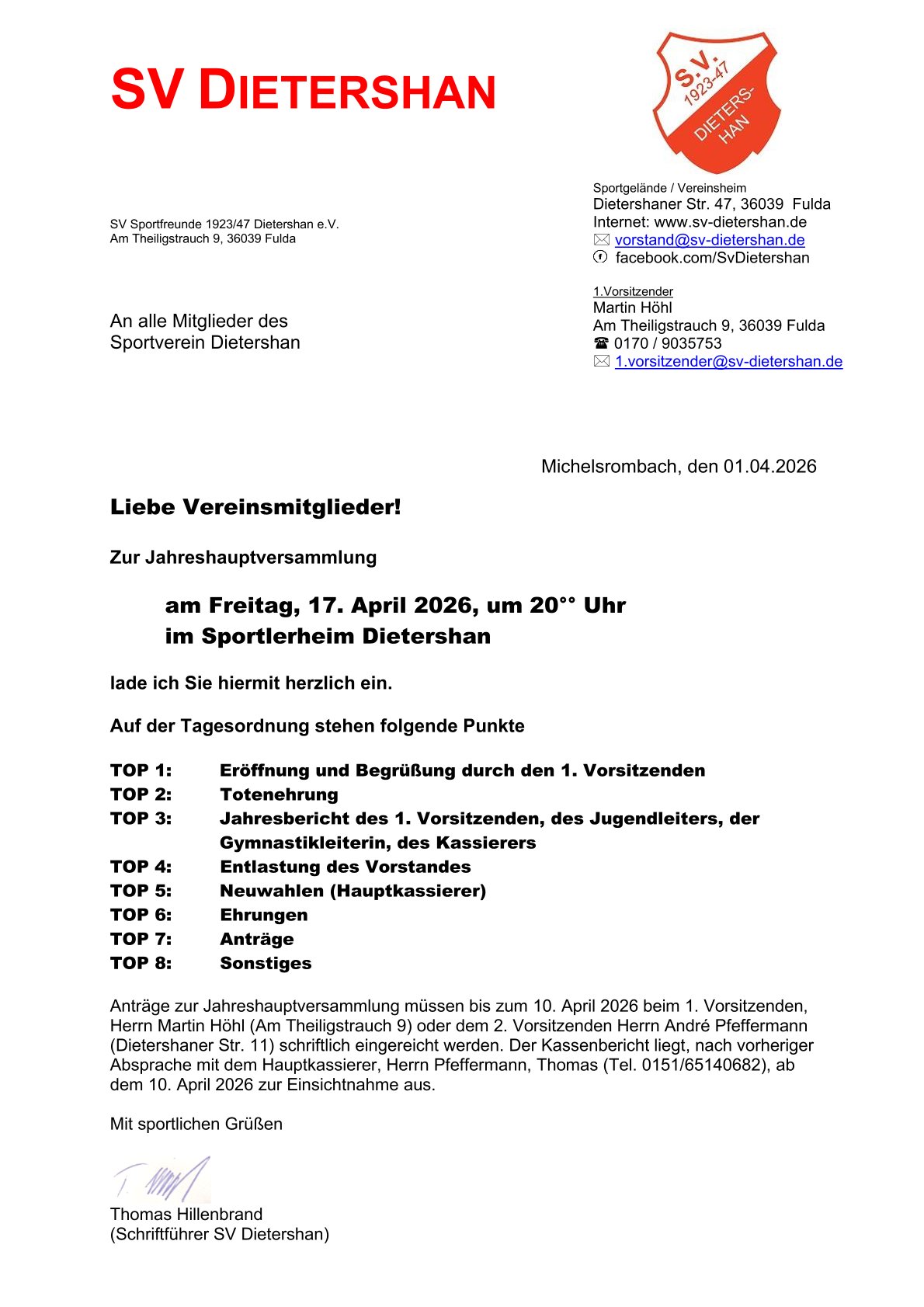 Am Freitag, den 17. April, um 20:00 Uhr fand die diesjährige Jahreshauptversammlung des SV Dietershan statt. Hier findet ihr den Bericht zur der JHV.