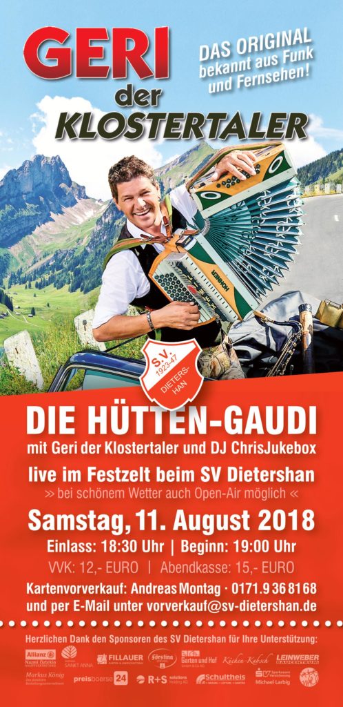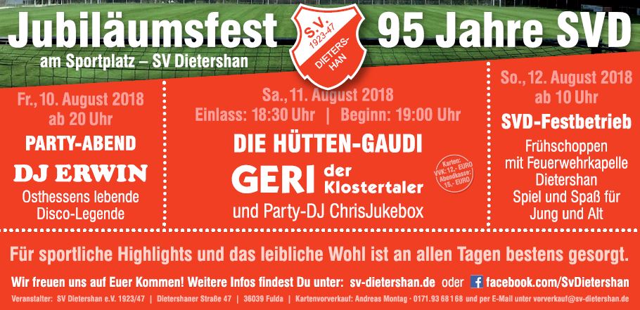 Vom Fr. 10. – So. 12. August 2018 feiert der SV Dietershan sein 95. jähriges bestehen und die Gymnastikabteilung des SV Dietershan ihr 40. jähriges. Dies wird an 3 Tagen groß gefeiert werden. Ein besonderes Highlight wird am Samstag, den 11. August 2018 der Auftritt von Geri der Klostertaler und DJ Chris-Jukebox werden. Aber auch am Freitag, den 10. August wird groß mit DJ Erwin gefeiert, bevor am Sonntag, den 12. August 2018 das Sportfest mit einem Kommerstag ausklingeln wird. Am Sonntag, wird sowohl für unseren kleinen Gästen als auch für die großen einiges an Abwechslung geboten werden.