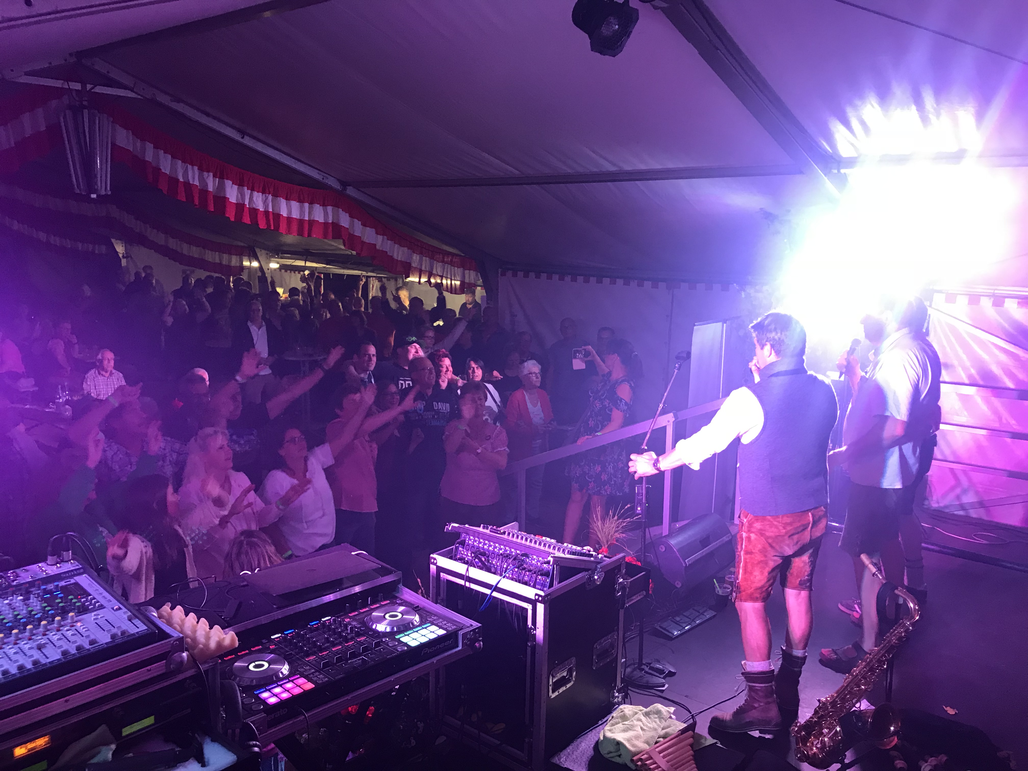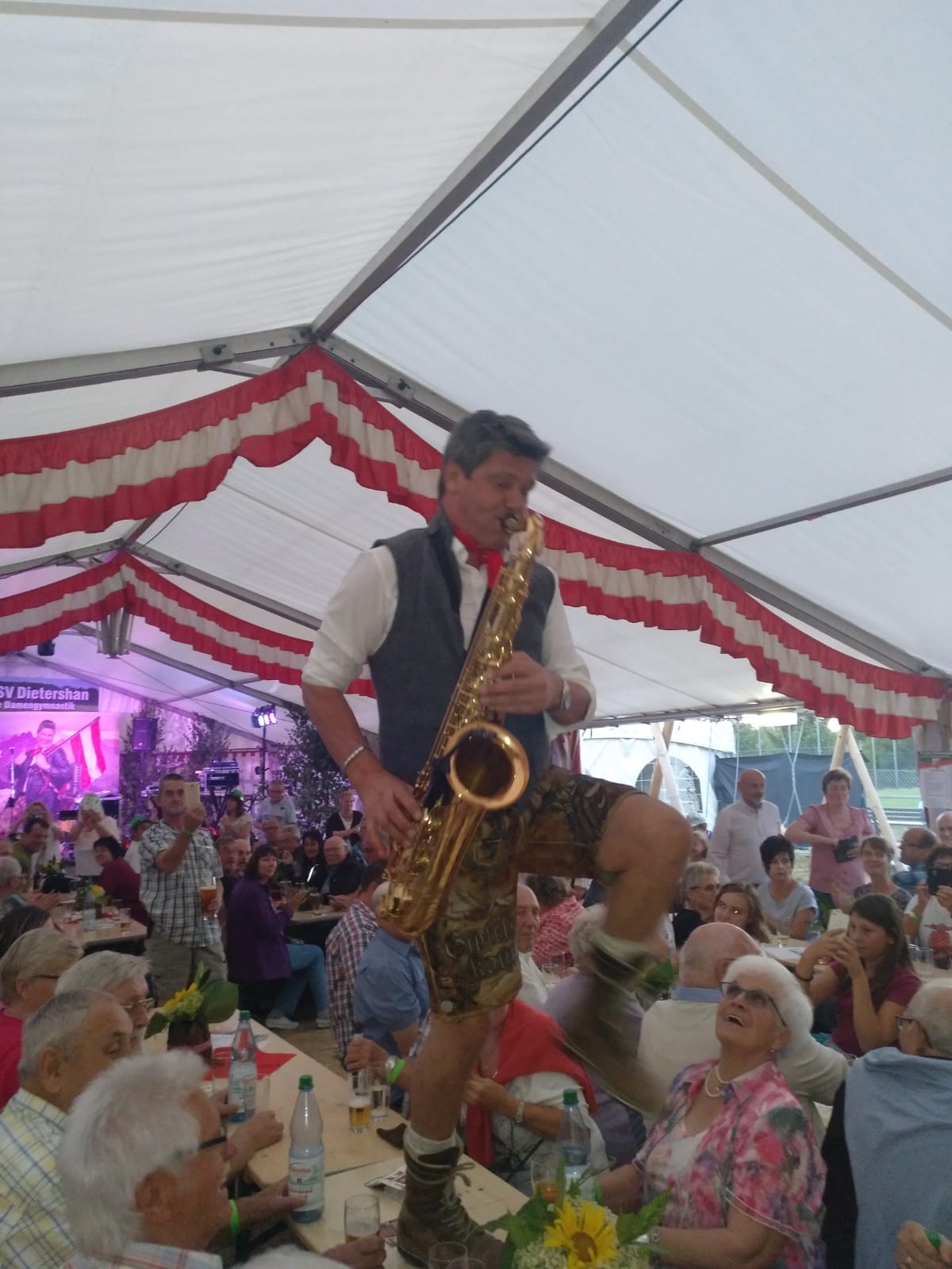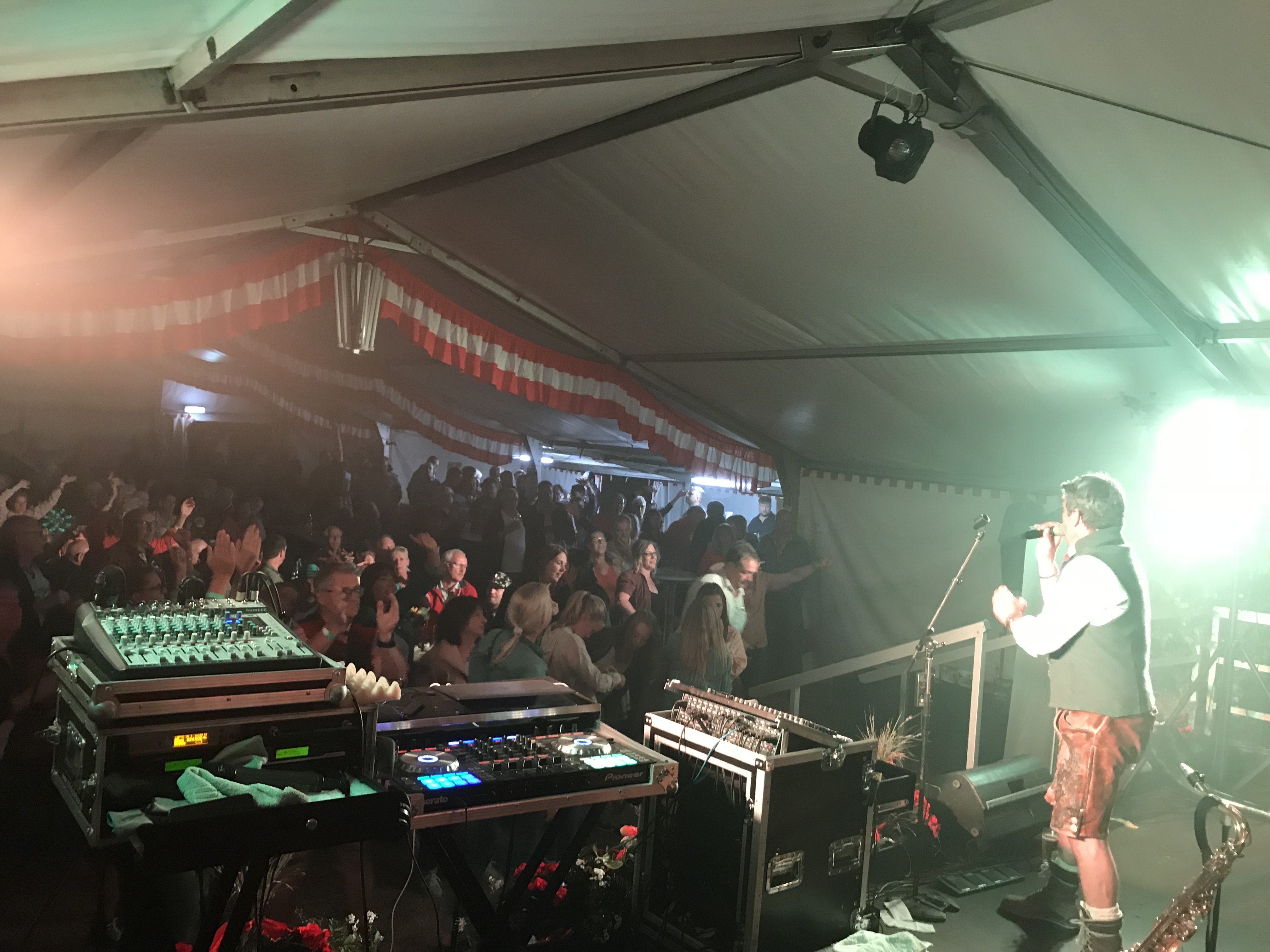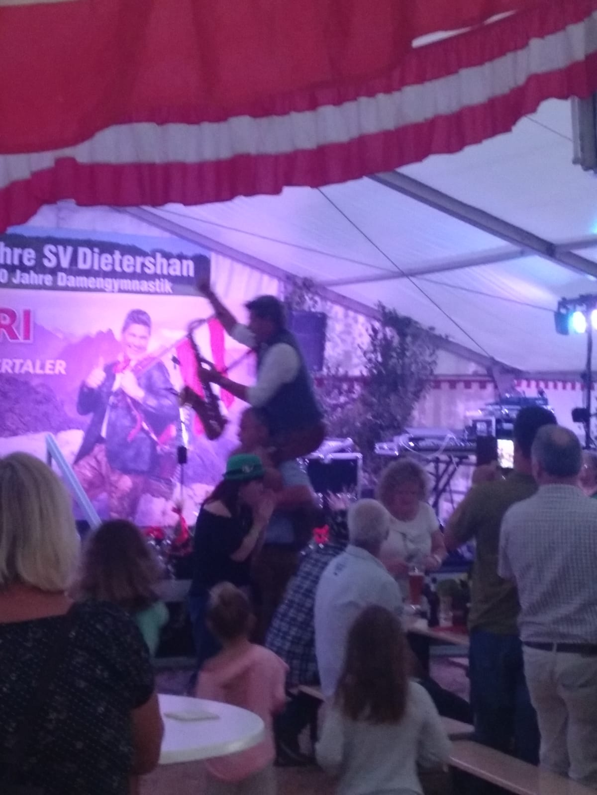 Nach dem erfolgreichen Beginn am Freitagabend, war es samstags ruhiger auf dem Sportgelände des Sportvereins Dietershan, bevor am Samstagabend die große Hüttengaudi mit „Geri der Klostertaler“ und seinem DJ „ChrisJukebox“ so richtig losging. Tagsüber wurde das Zelt mit Tischdeko Gardinen und Bäumen in eine Alpenflair-Hütte verzaubert. Auch an diesem Abend war das Zelt gut besucht und bereits nach einer halben Stunde war die Stimmung famos, als Geri mit seinem Saxophon und Akkordeon auf den Tischen die Gäste –vor allem weibliche Gäste- verzückte.
