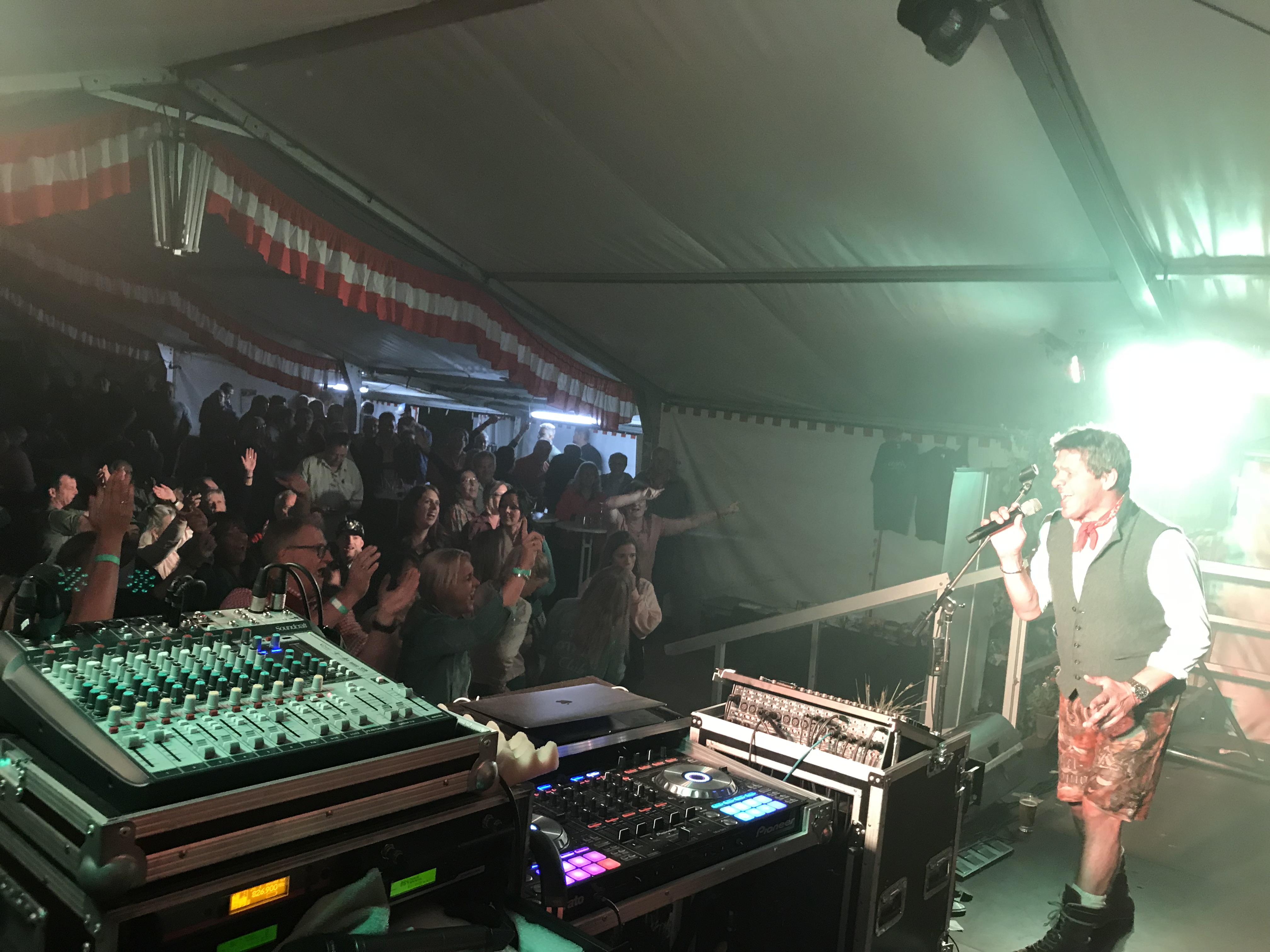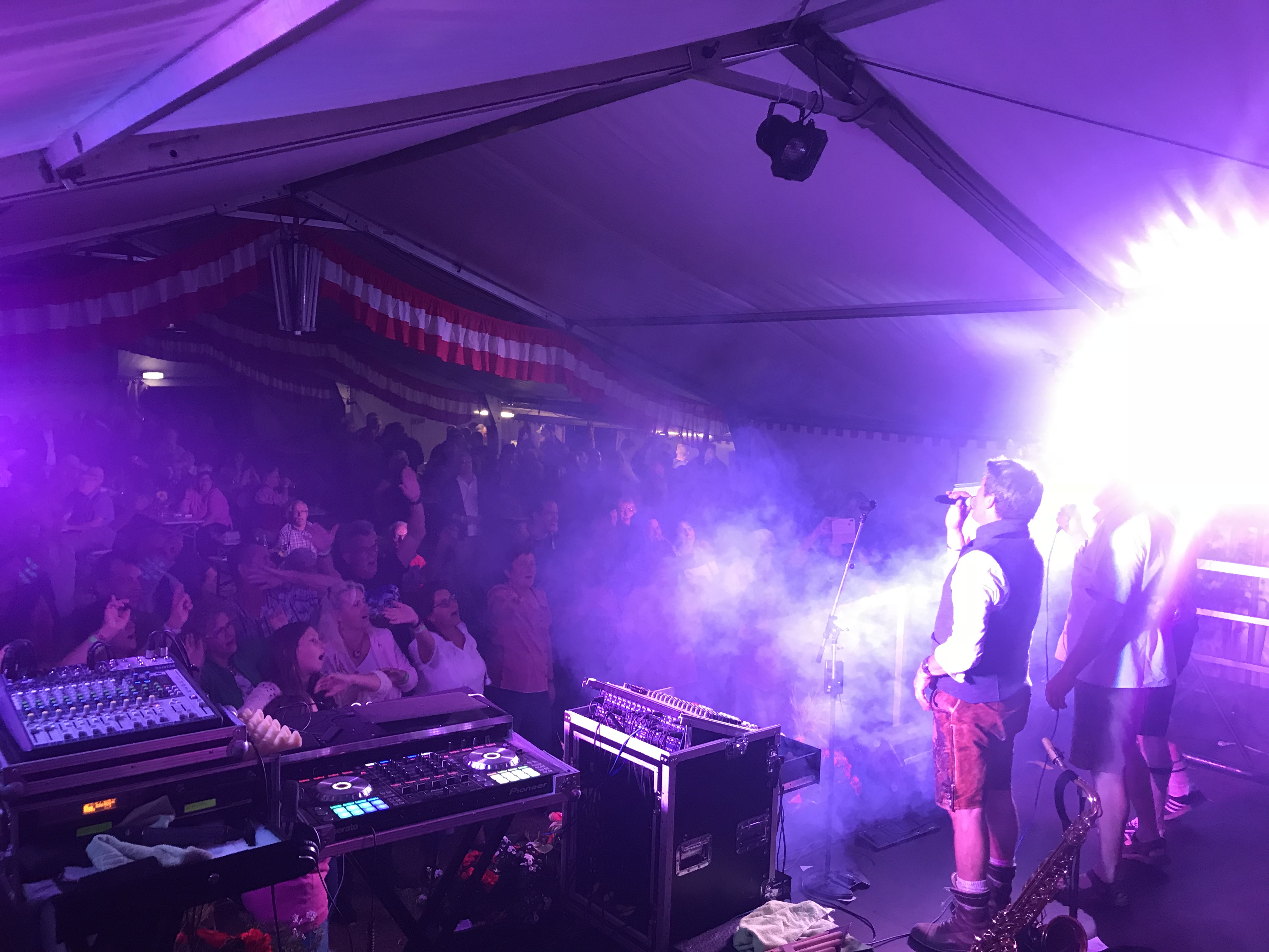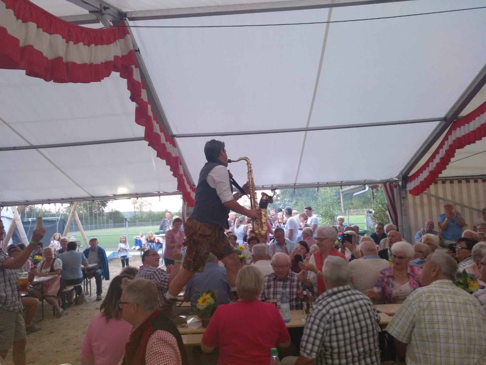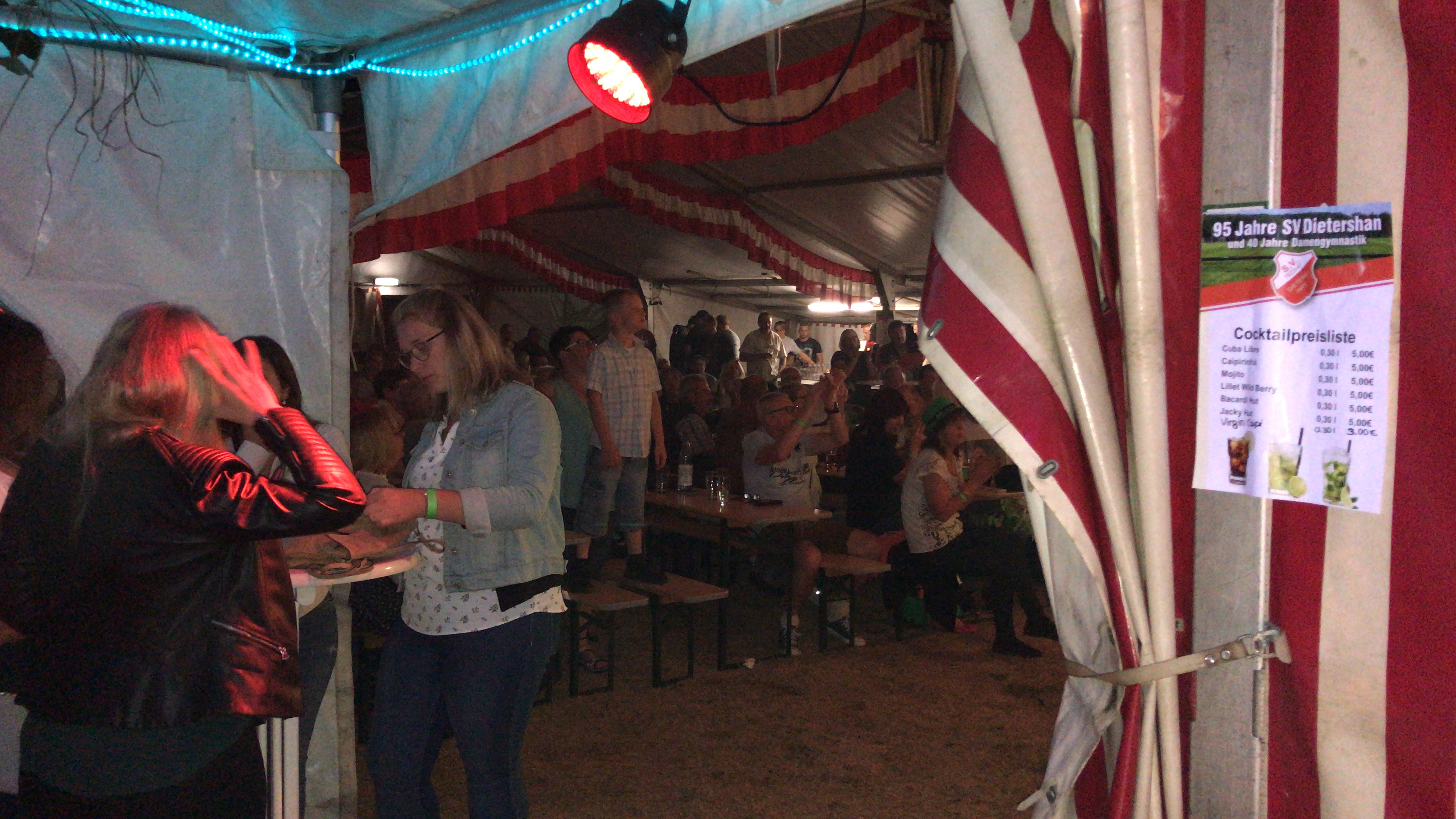 Nach dem erfolgreichen Beginn am Freitagabend, war es samstags ruhiger auf dem Sportgelände des Sportvereins Dietershan, bevor am Samstagabend die große Hüttengaudi mit „Geri der Klostertaler“ und seinem DJ „ChrisJukebox“ so richtig losging. Tagsüber wurde das Zelt mit Tischdeko Gardinen und Bäumen in eine Alpenflair-Hütte verzaubert. Auch an diesem Abend war das Zelt gut besucht und bereits nach einer halben Stunde war die Stimmung famos, als Geri mit seinem Saxophon und Akkordeon auf den Tischen die Gäste –vor allem weibliche Gäste- verzückte.