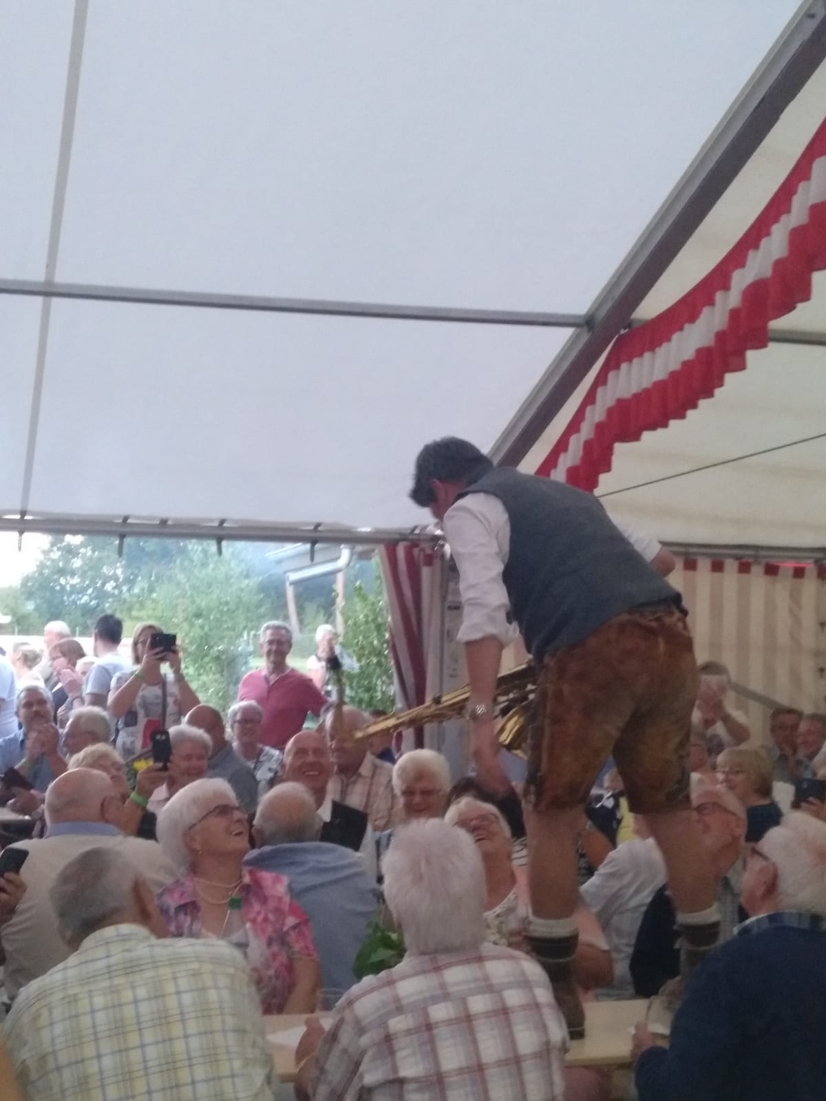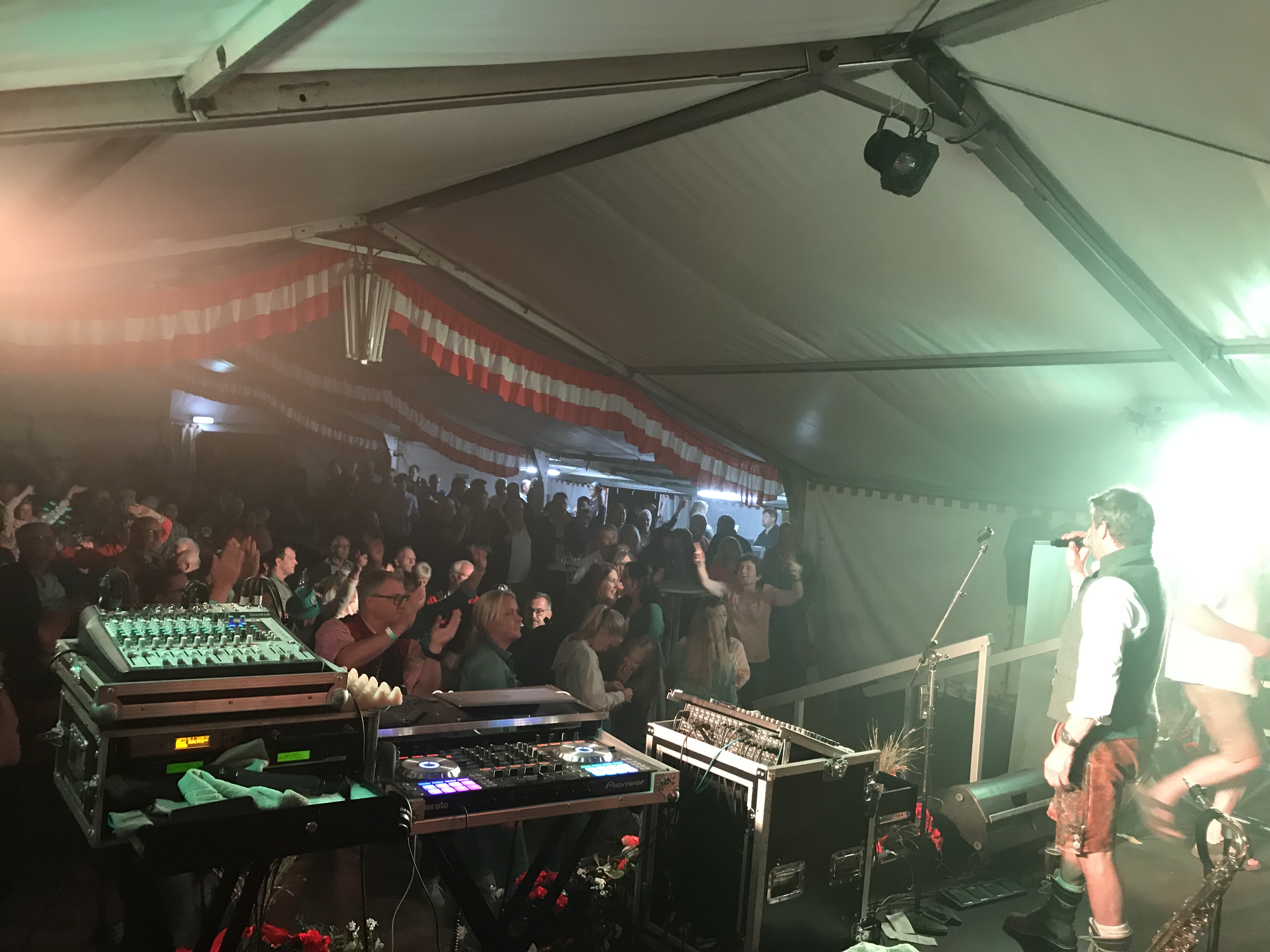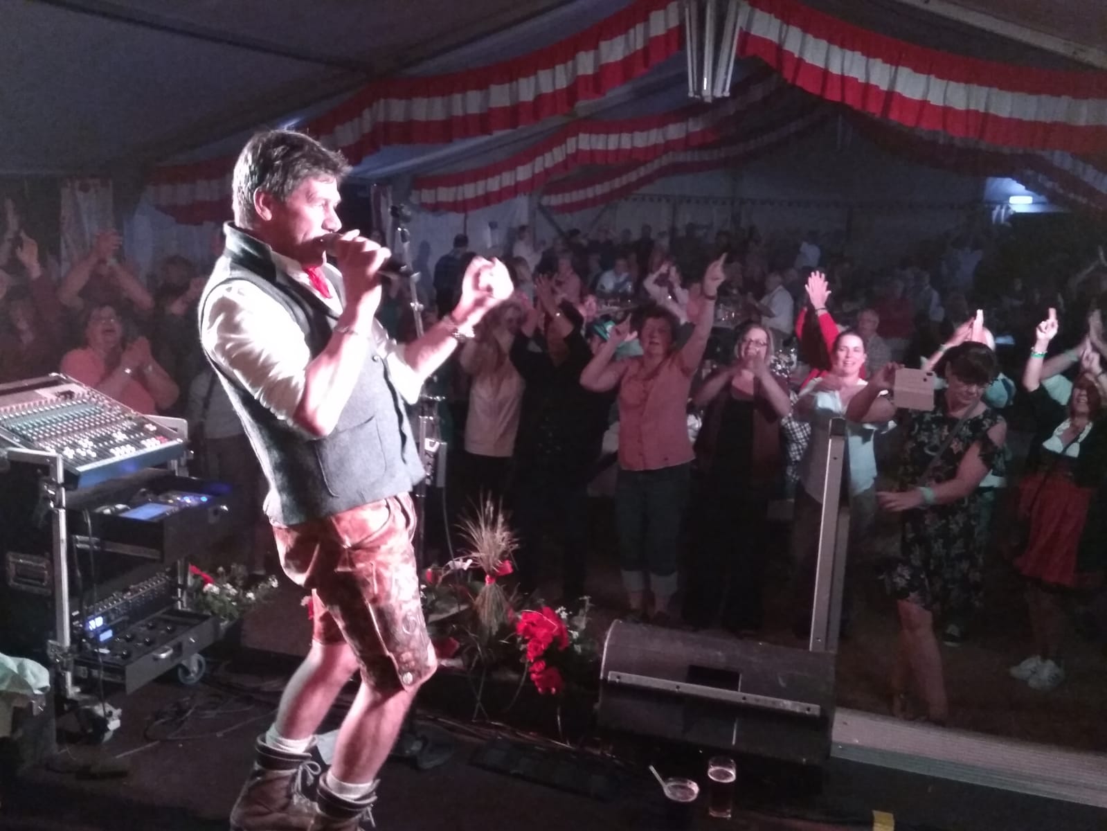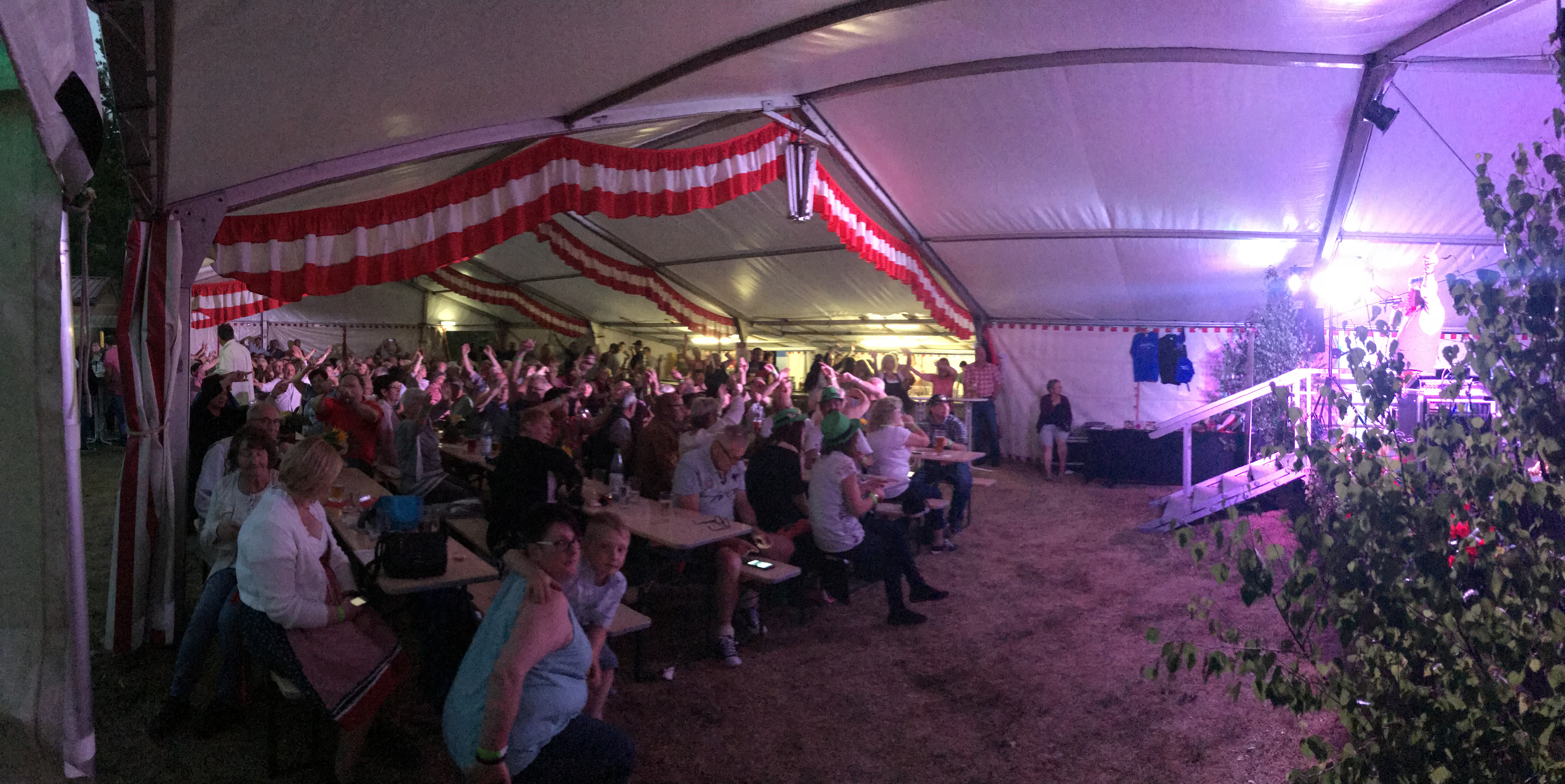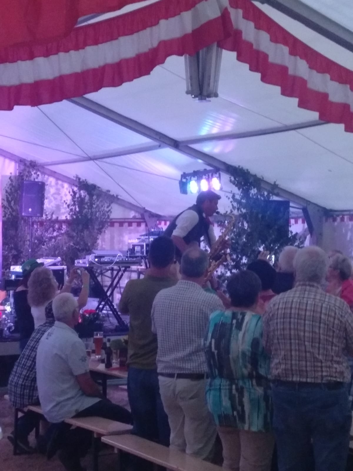Nach dem erfolgreichen Beginn am Freitagabend, war es samstags ruhiger auf dem Sportgelände des Sportvereins Dietershan, bevor am Samstagabend die große Hüttengaudi mit „Geri der Klostertaler“ und seinem DJ „ChrisJukebox“ so richtig losging. Tagsüber wurde das Zelt mit Tischdeko Gardinen und Bäumen in eine Alpenflair-Hütte verzaubert. Auch an diesem Abend war das Zelt gut besucht und bereits nach einer halben Stunde war die Stimmung famos, als Geri mit seinem Saxophon und Akkordeon auf den Tischen die Gäste –vor allem weibliche Gäste- verzückte.