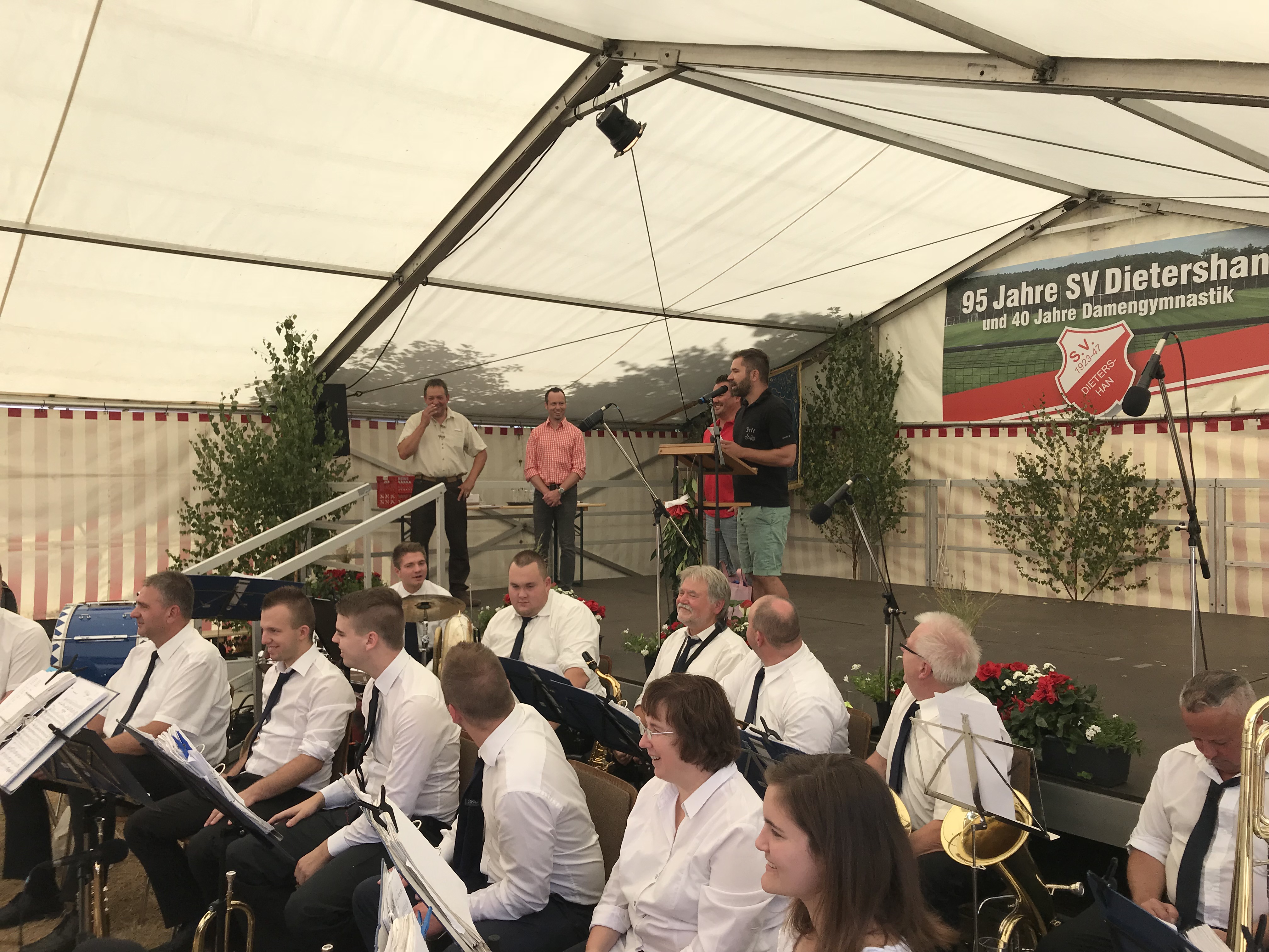 Etliche geladene Gäste wie Fuldas Bürgermeister Dag Wehner, als Vertreter des Orstvorstehers Gerhard Bleuel, die Sportfreunde der SG Steinau, des SV Steinhaus und die SG Marbach konnte der Vorsitzende des SV Dietershan, André Pfeffermann, begrüßen, der zusammen mit Andreas Montag durch das Programm führte. Nach der Begrüßung der Gäste wurde mit musikalischer Unterstützung der Feuerwehrkapelle Dietershan aller verstorbenen Mitglieder gedacht. Anschließend übernahm der Bürgermeister der Stadt Fulda das Wort und dankte den Sportfreunden Dietershan für die Einladung und stellte fest, wie wichtig Ehrenamtliche Vereinsarbeit für das Miteinander und auch die Stadt Fulda von Bedeutung sind. Weitere Gastredner waren Gerhard Bleuel der den Ortsvorsteher Haiko Fillauer und ebenfalls die Jagdgenossenschaft Dietershan / Bernhards vertrat. Michael Larbig von der Sparkassenversicherung, Guido Abel als Vorsitzender der Freiwilligen Feuerwehr Dietershan, Norbert Lippert als Vorsitzender des Förderverein, Martin Meinung als Vorsitzender des Jeff e.V., Elmar Jestädt und Bernhard Pfeffermann als Vertreter des Worschtclub, Michael Franke als Vorsitzender der SG Marbach, Vertreter der SG Steinau sowie Emil Hahner als Vertreter des SV Steinhaus und als Vertretung des Kreisfussballausschusses (KFA) wollten es sich nicht nehmen lassen ein paar Grußworte loszuwerden.