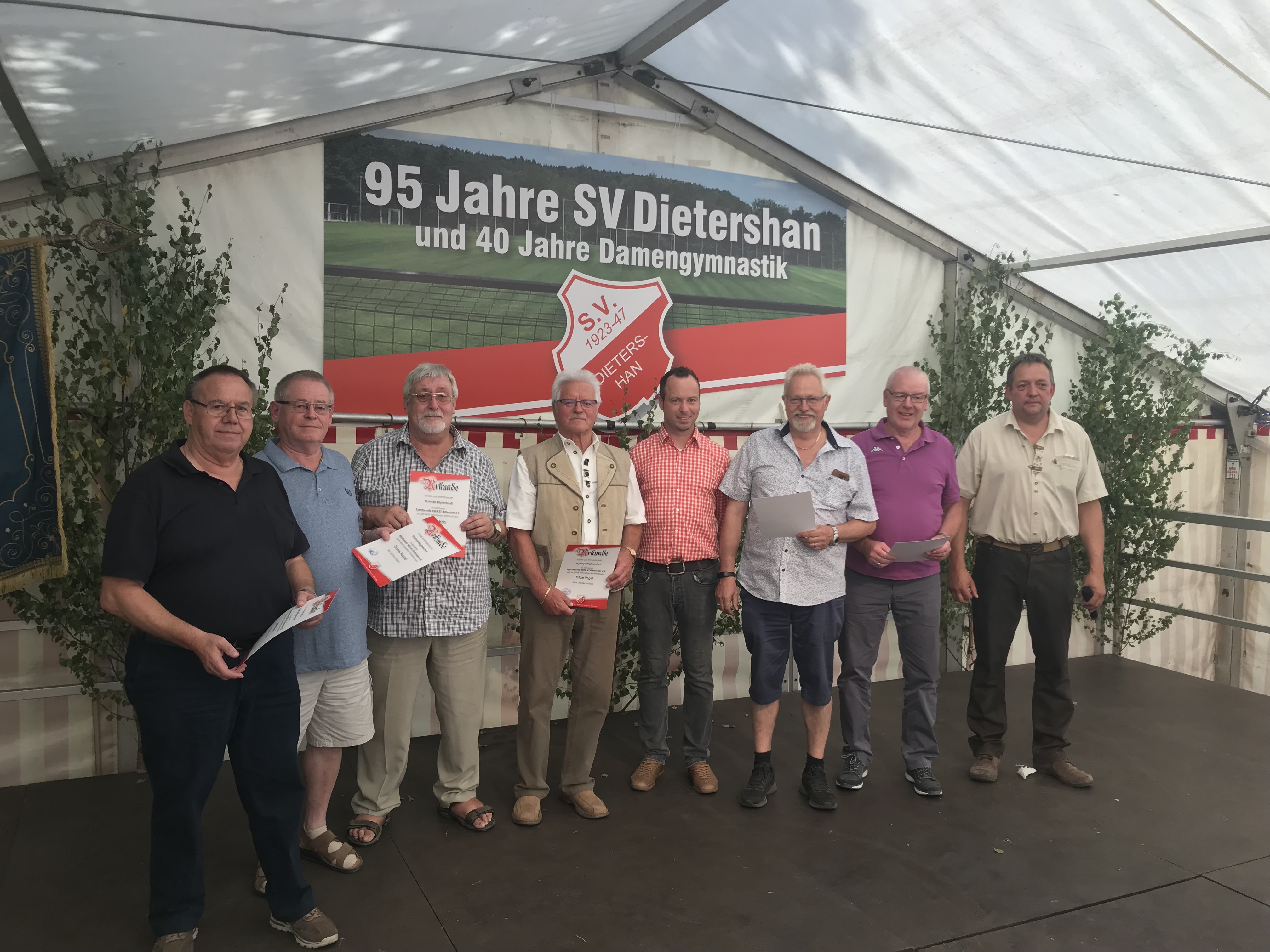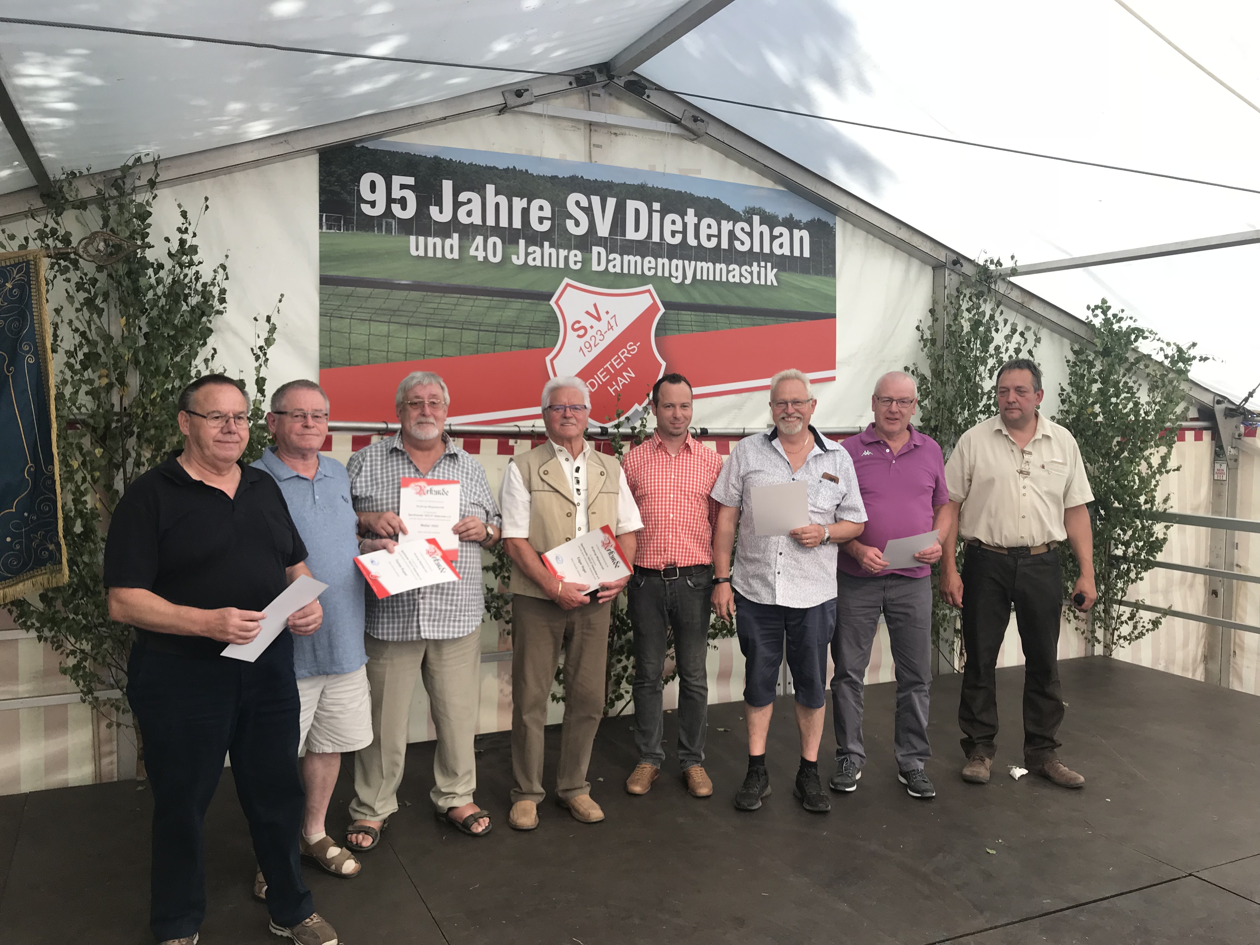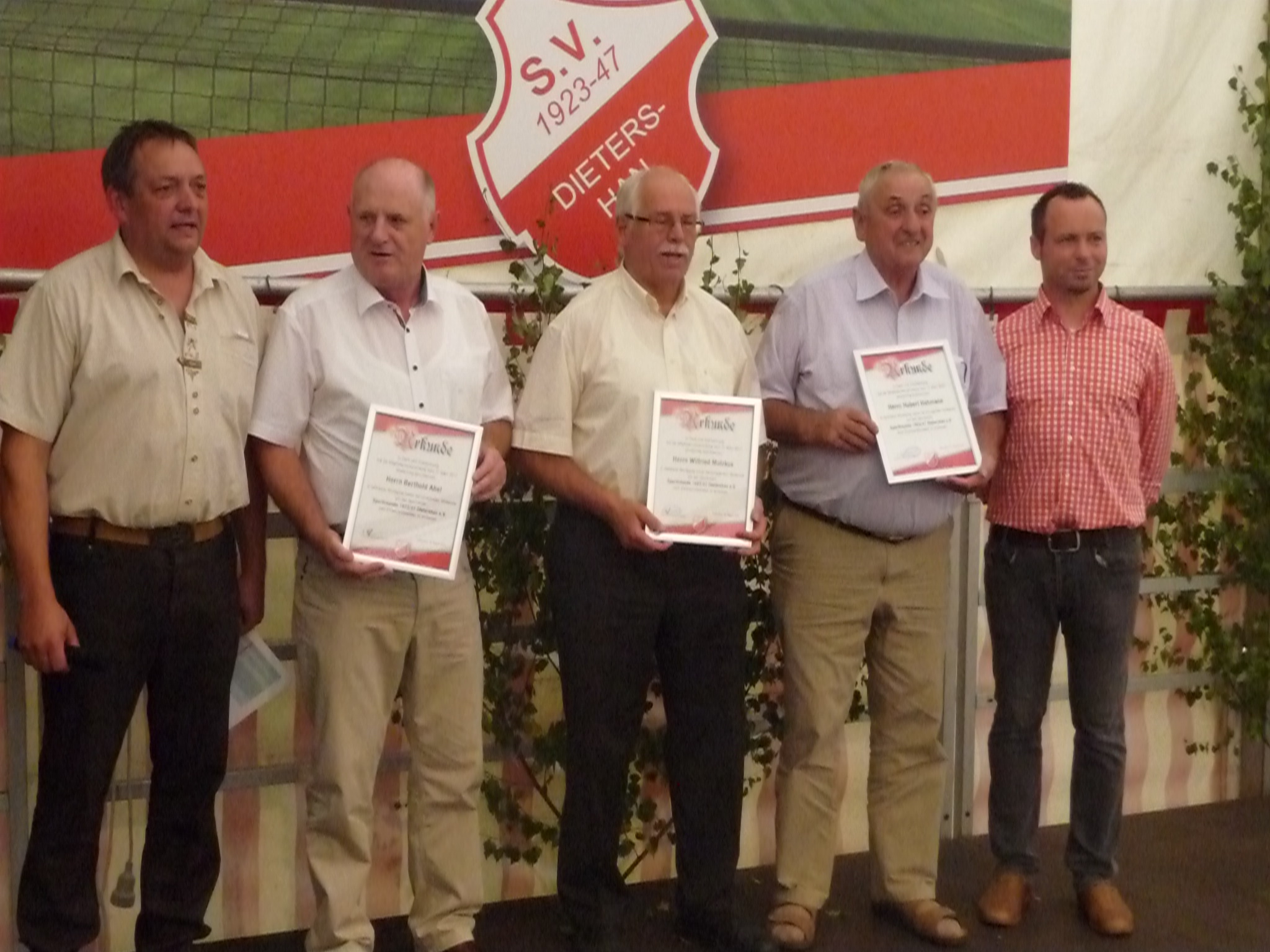 Anschließend wurden etliche Ehrungen vollzogen. Diese waren 25 Jahre Mitgliedschaft, 30 Jahre Mitgliedschaft, 40 Jahre Mitgliedschaft, 50 Jahre Mitgliedschaft, 60 Jahre Mitgliedschaft und 70 Jahre Mitgliedschaft. Besonders hervorzuheben sind die drei Ehrungen zum Ehrenvorsitzenden, die für ihre außerordentlichen Wohltaten für den Verein ausgezeichnet wurden. Diese waren Berthold Abel, Wilfried Motzkus und Hubert Hohmann. Zudem war es für den Sportverein Dietershan ein Highlight Reinhold Montag für stolze 70 Jahre Mitgliedschaft zu ehren.