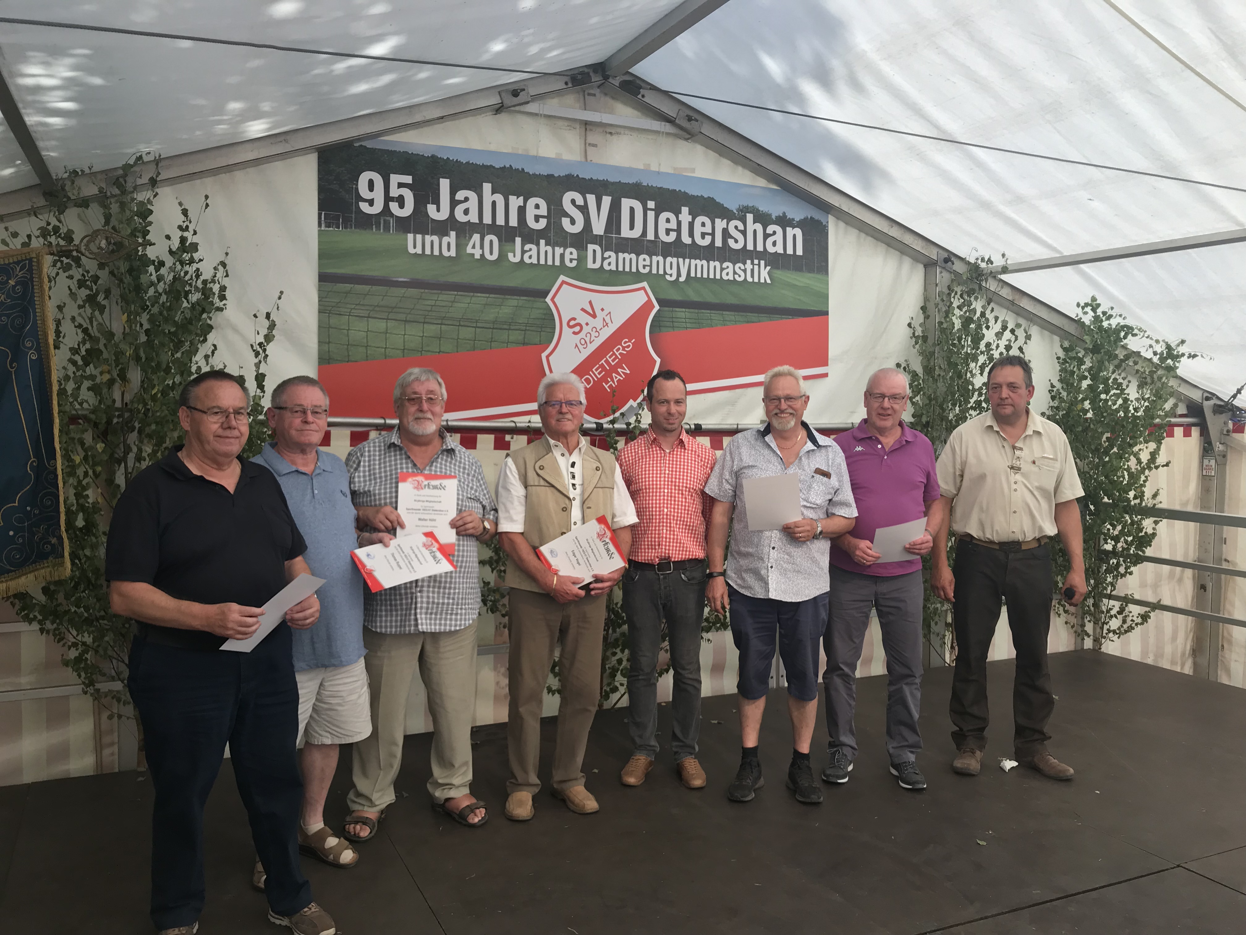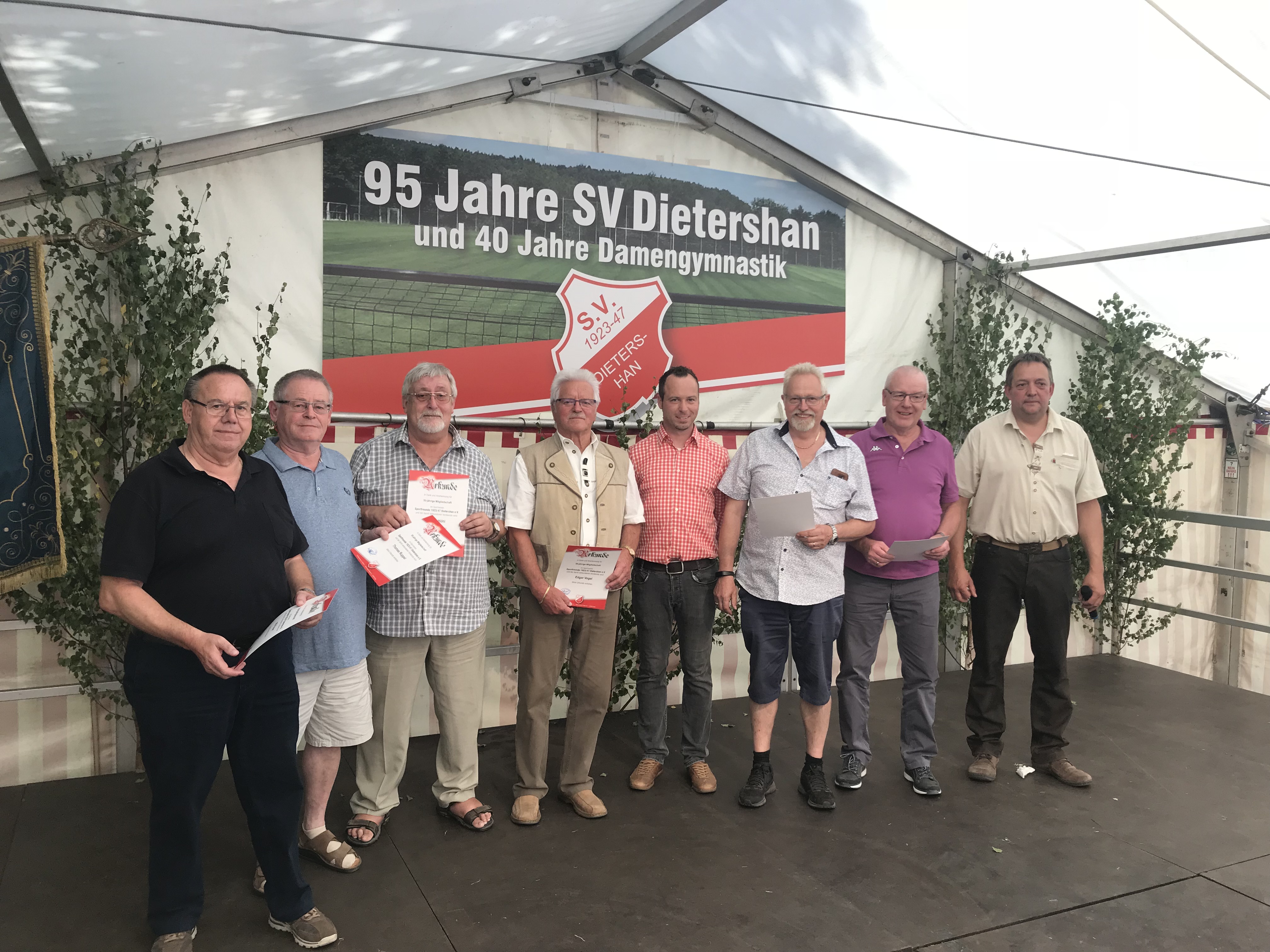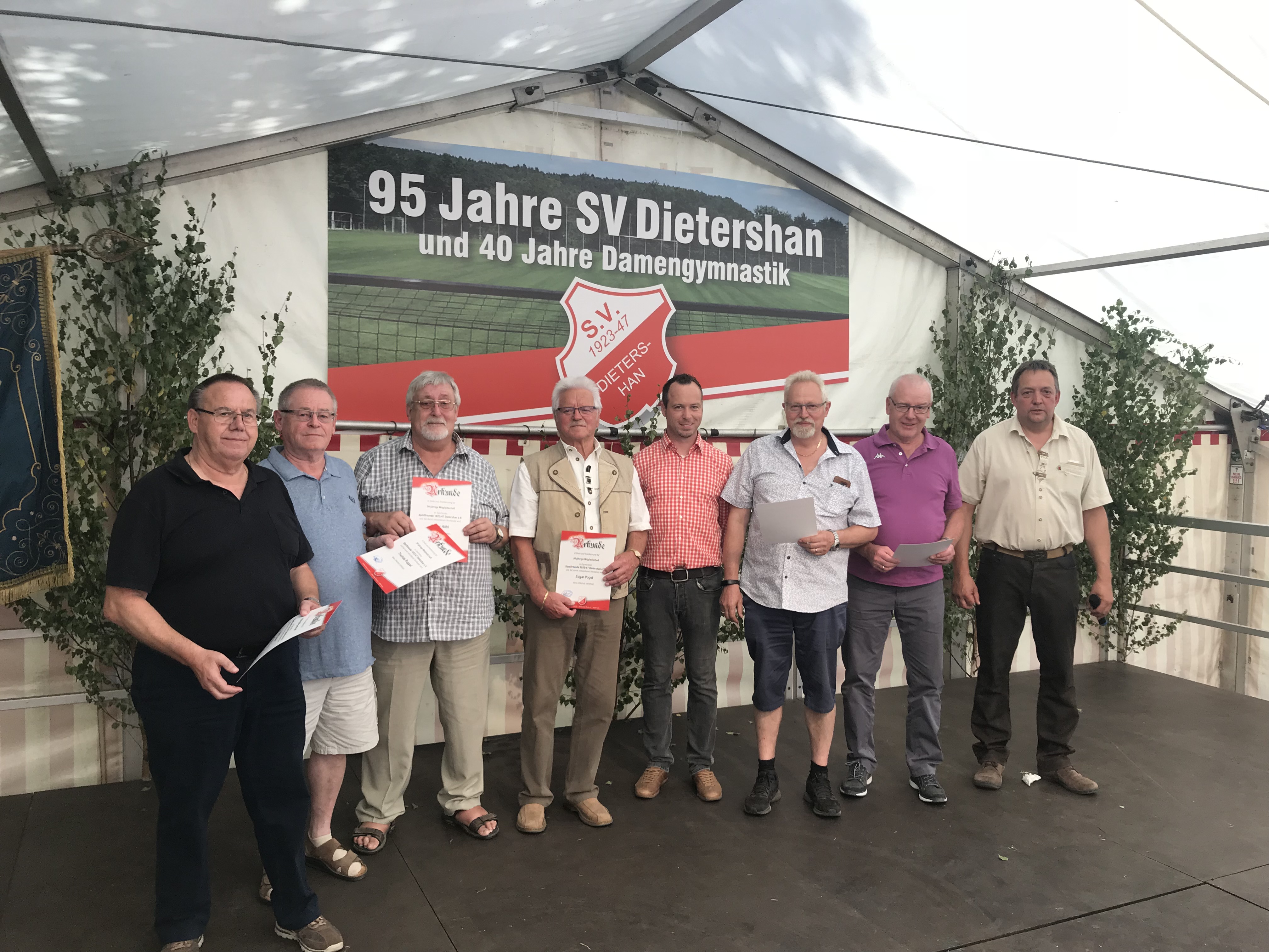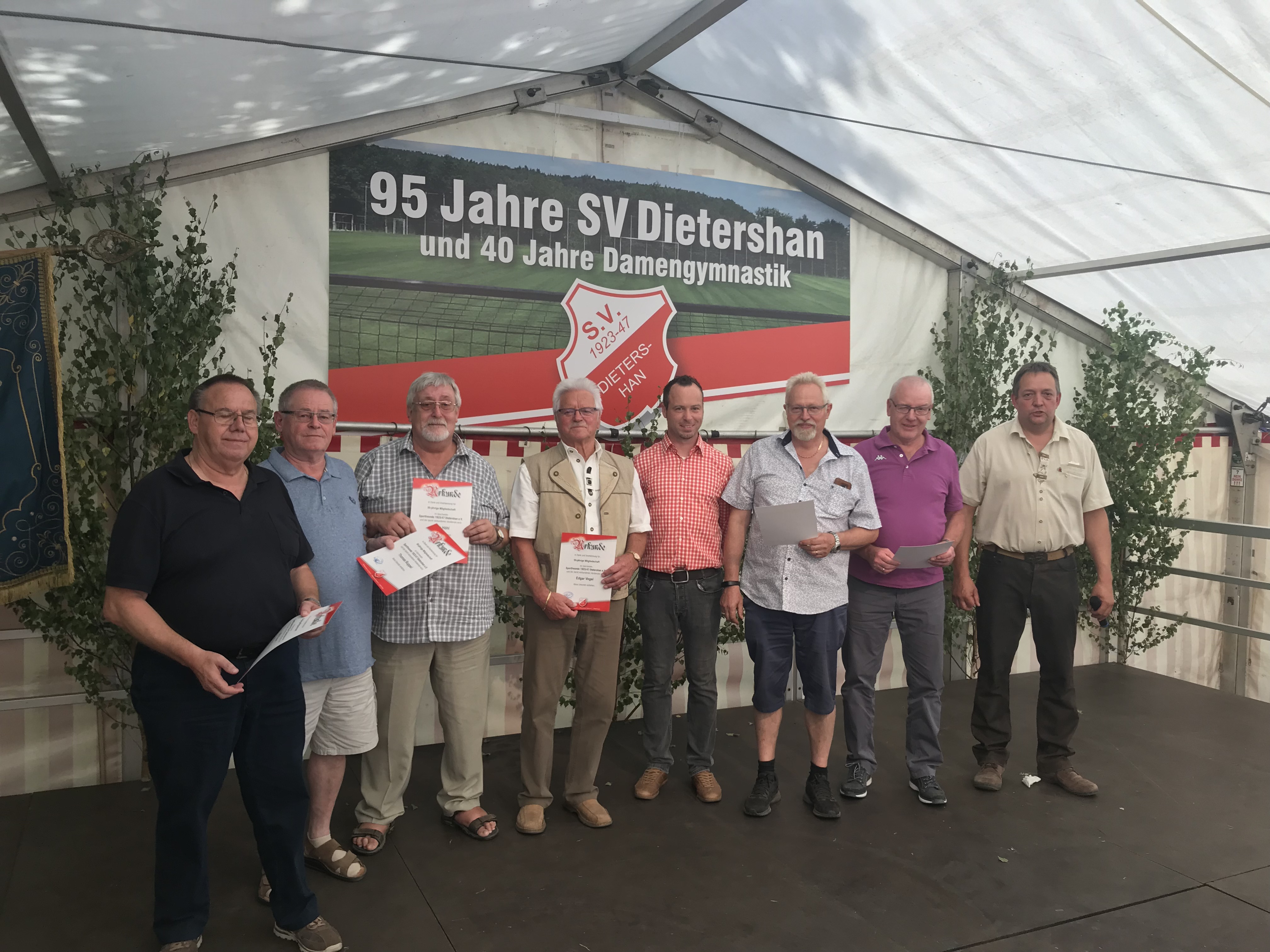 Anschließend wurden etliche Ehrungen vollzogen. Diese waren 25 Jahre Mitgliedschaft, 30 Jahre Mitgliedschaft, 40 Jahre Mitgliedschaft, 50 Jahre Mitgliedschaft, 60 Jahre Mitgliedschaft und 70 Jahre Mitgliedschaft. Besonders hervorzuheben sind die drei Ehrungen zum Ehrenvorsitzenden, die für ihre außerordentlichen Wohltaten für den Verein ausgezeichnet wurden. Diese waren Berthold Abel, Wilfried Motzkus und Hubert Hohmann. Zudem war es für den Sportverein Dietershan ein Highlight Reinhold Montag für stolze 70 Jahre Mitgliedschaft zu ehren.