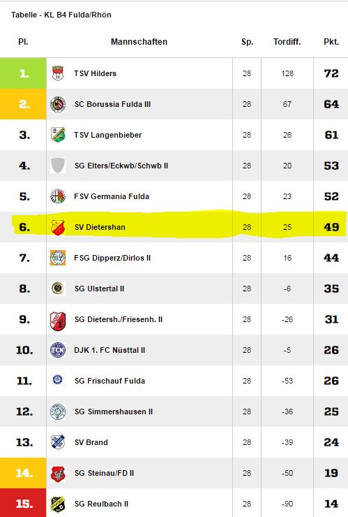 leider kann kein detaillierter Spielbericht erfolgen, da wenige Info´s vorliegen. Laut Zuschauerberichten, hatte der SVD etliche Chancen aber auch Samuel Held konnte sich mehrfach erfolgreich ausszeichnen. Das Siegtor der Gastgeber war eine klare Abseitsstellung die der Schiedsrichter nicht erkannte. Damit beendet der SV Dietershan die Saison 2015/2016 auf dem 6. Tabellenplatz.