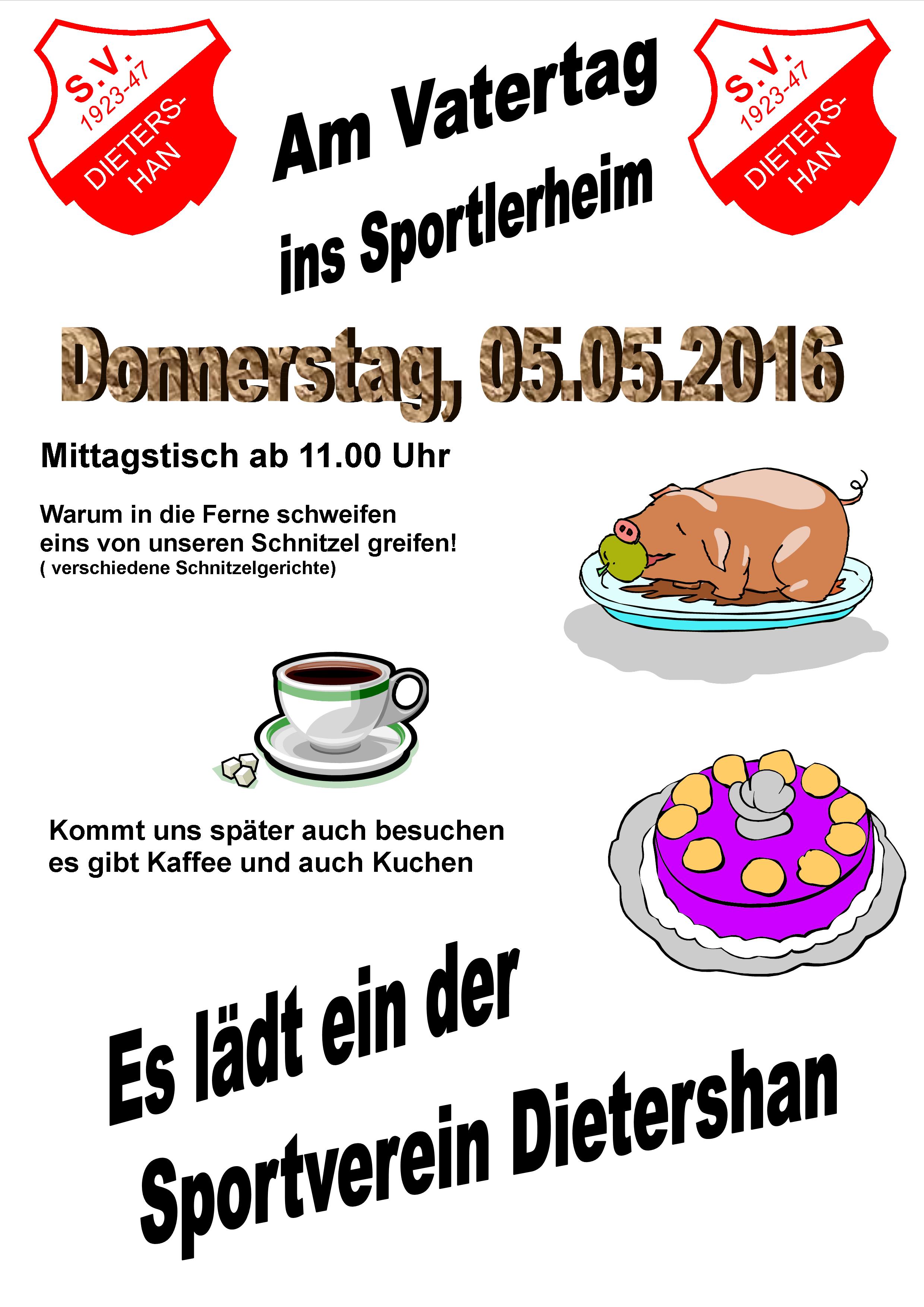 Auch dieses Jahr findet wieder das Vatertagsfest des SV Dietershan statt. Hier auch der Flyer zu dieser Veranstaltung. Wir freuen uns auf euer kommen.
